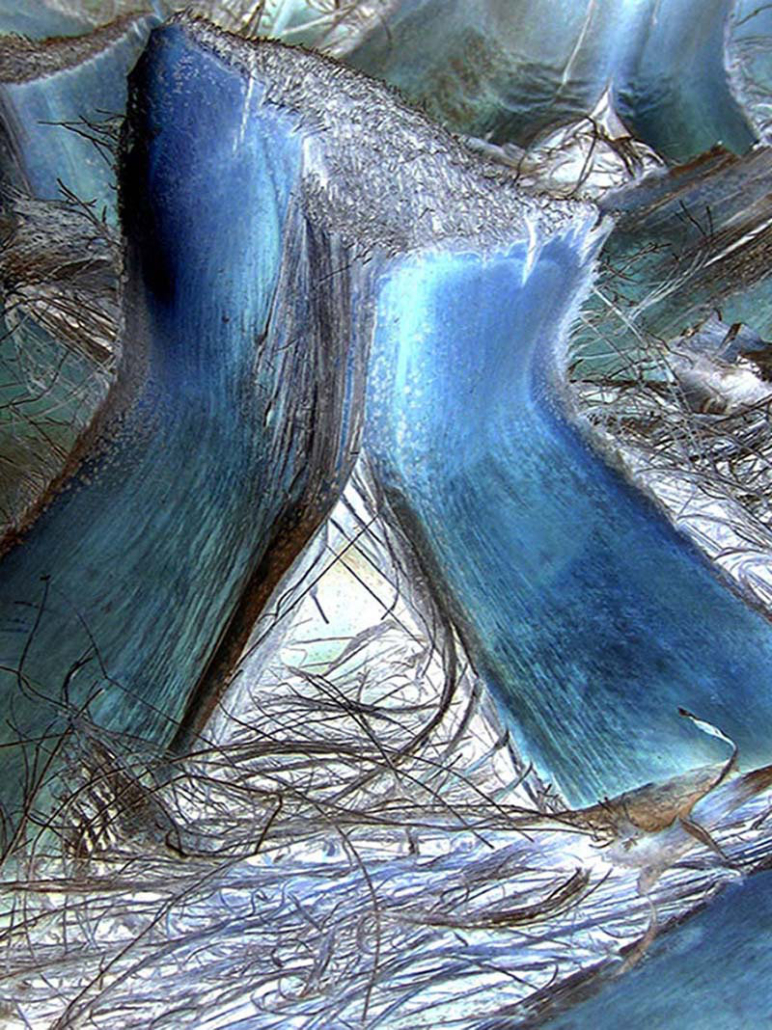 In Zypern entstanden ist die Serie „Palmenblätter“. Ähnlich wie bei den Heuballen verwandelt die Künstlerin Margrit Romberg die Strukturen, Schattierungen und Lichtspiele der Palmenblätter in faszinierende blaue Phantasiewelten.